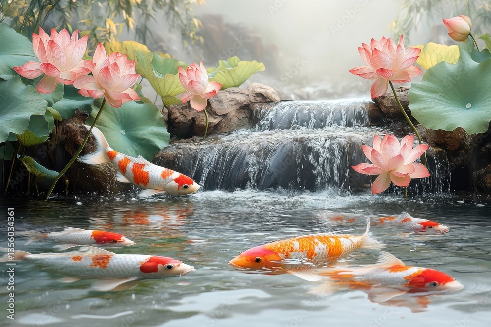 Aluminium Koi fish swimming among pink lotus flowers near a tranquil waterfall