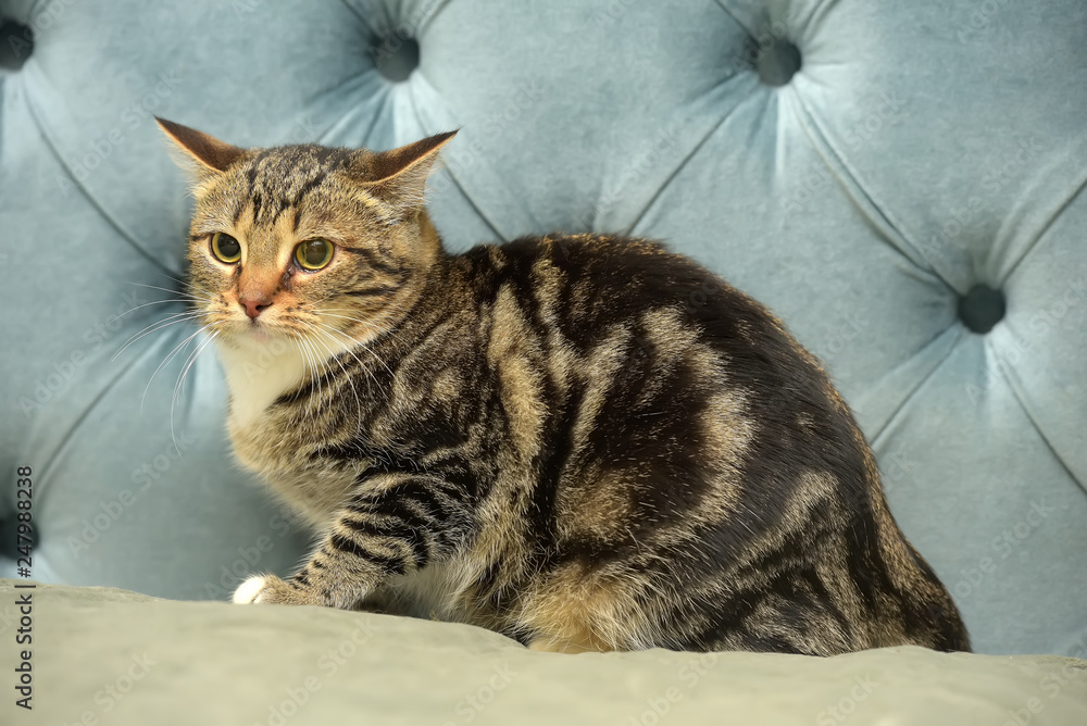 Aluminium Dibond korthaar kat met een marmeren kleur op een blauwe achtergrond met een bange blik #247988238