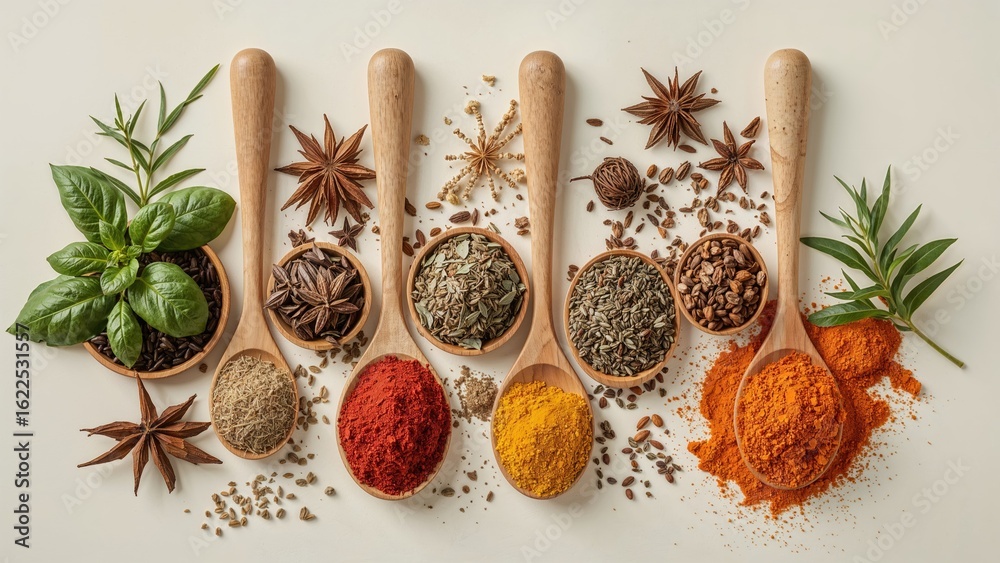 Aluminium Schilderij Wooden spoons holding a variety of bright herbs and spices