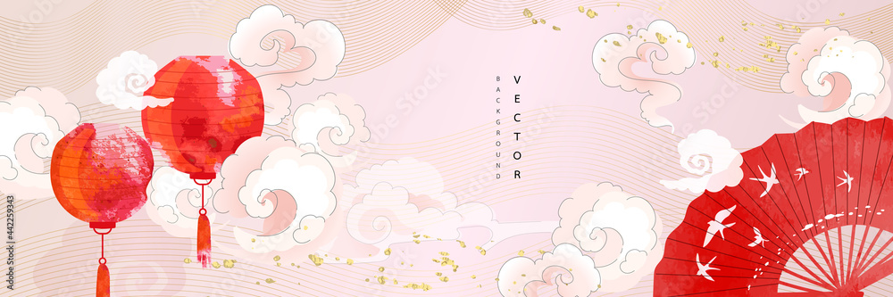 Fotobehang Aziatische achtergrond, Oosterse Chinese en Japanse stijl abstract patroon achtergrondontwerp met pioenbloem versieren in aquarel textuur #442259343