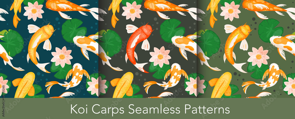 Fotobehang Koi karper vissen naadloze patroon vector illustratie set. Cartoon traditionele Aziatische fortuin symbool, koi karper vissen vissen zwemmen met tropische lotus water bloemen en natuur bladeren achtergrond #442783260