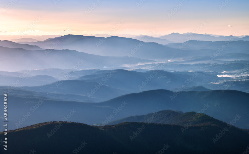 Fotobehang Bergen verlicht door felle zonnestralen bij zonsondergang in de herfst. Landschap met bergruggen in mist, rotsen, bos, kleurrijke lucht met oranje zonlicht in de herfst. Luchtfoto van de bergvallei. Bovenaanzicht #384648636