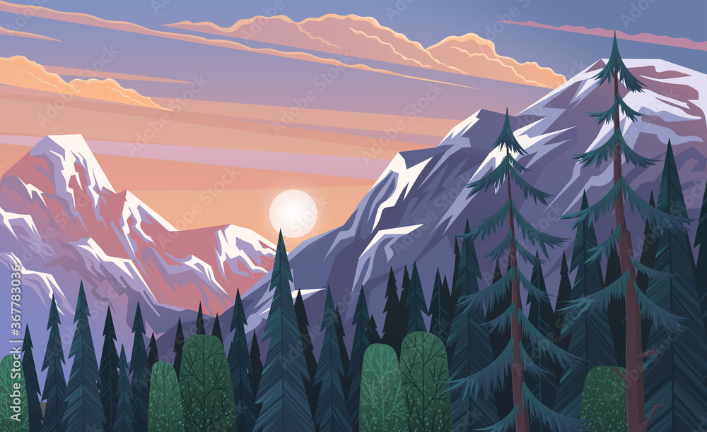 Muurcirkel Bergenlandschap, abstract lila zonsondergangpanorama, vectorillustratie. Berghelling bos achtergrond. Prachtig uitzicht op het berglandschap met besneeuwde toppen op een bewolkte hemel #367783036