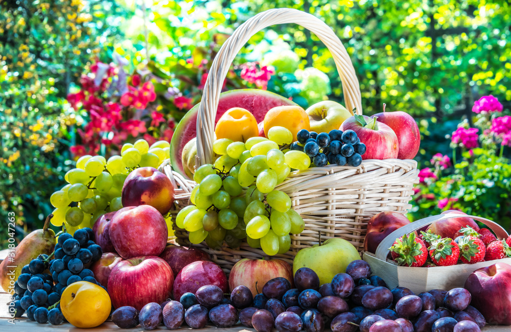 Canvas schilderij Verscheidenheid aan vers rijp fruit in de tuin. #318047263