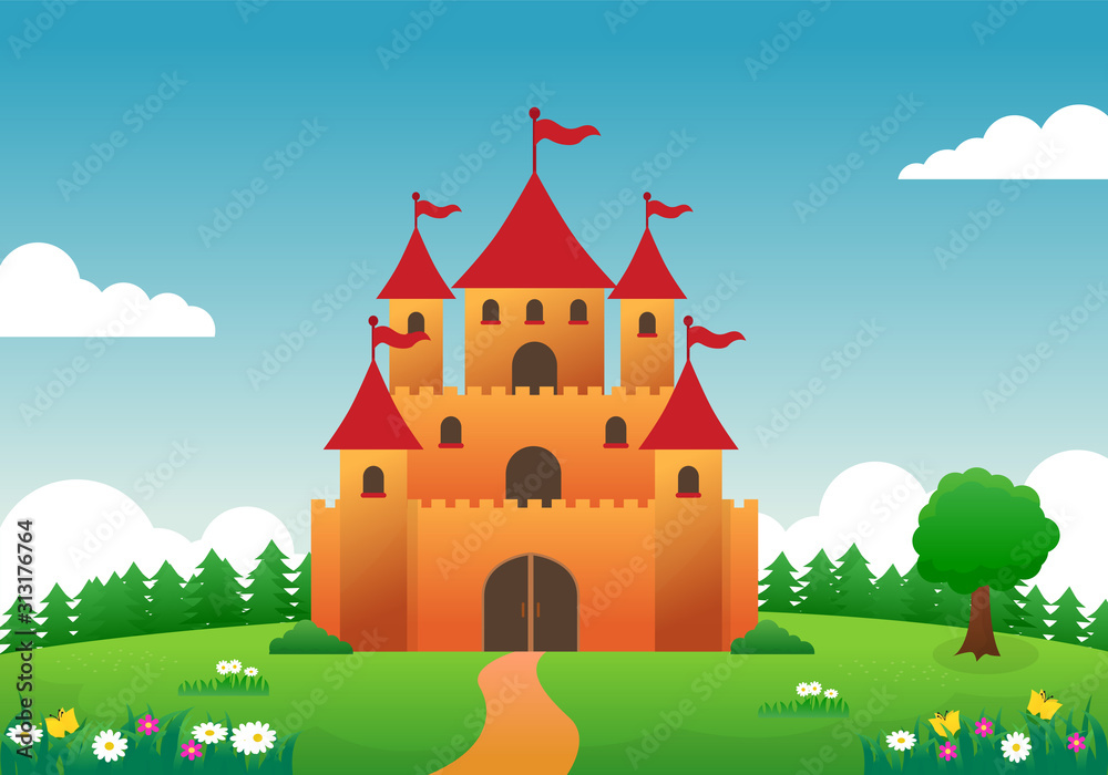 Canvas schilderij Kasteel op de heuvel cartoon afbeelding met schattig design. Fantasieachtergrond voor kinderen met kasteel, heldere lucht, wolken en groene weide #313176764