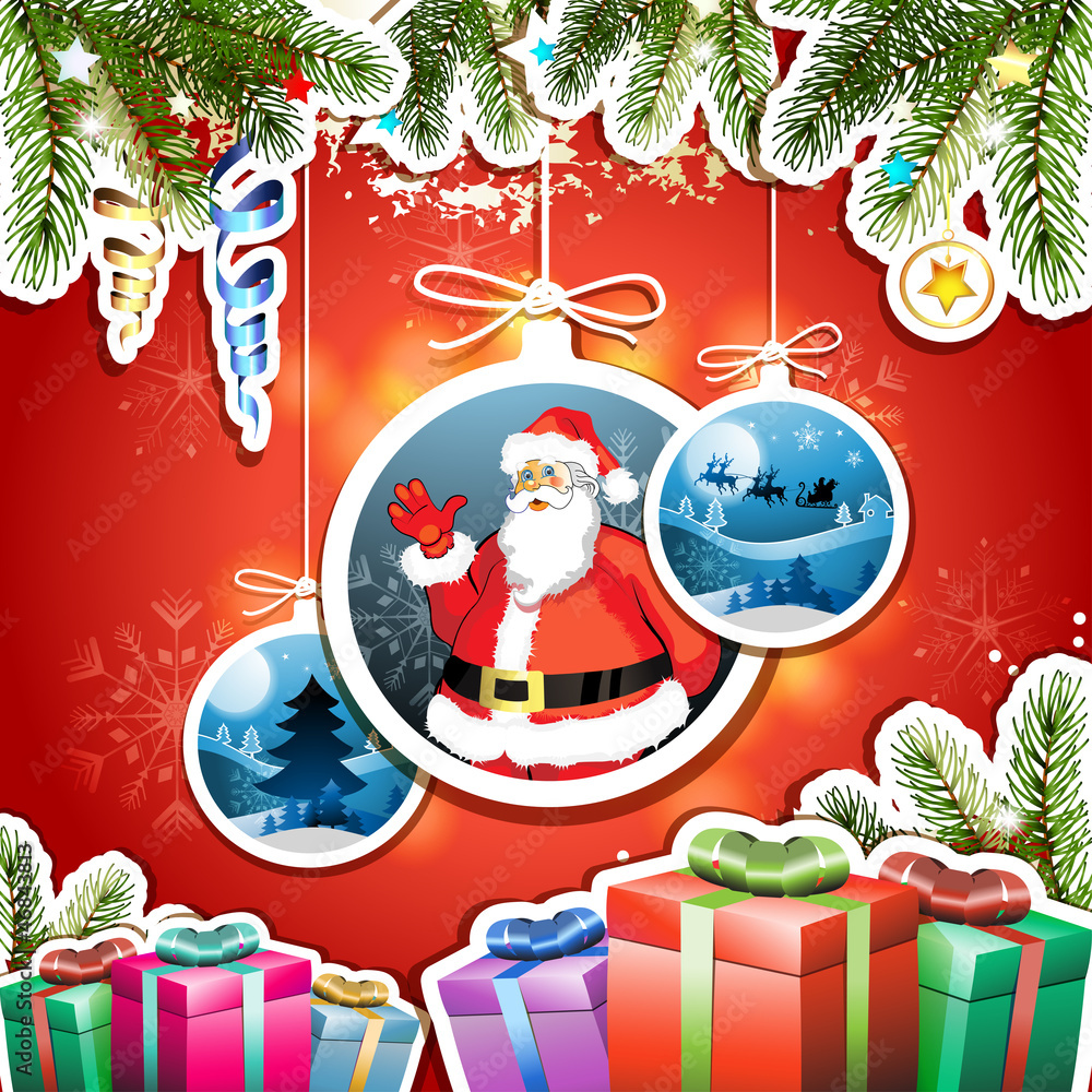 Canvas schilderij Kerstkaart met cadeautjes en Kerstman #46843813