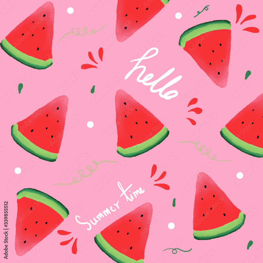 Canvas schilderij naadloze patroon met watermeloen. Leuke watermeloen fruit achtergrond, sticker, watermeloen behang, patroon vector texture.printing met in de hand getekende style.summer achtergrond. #339855512