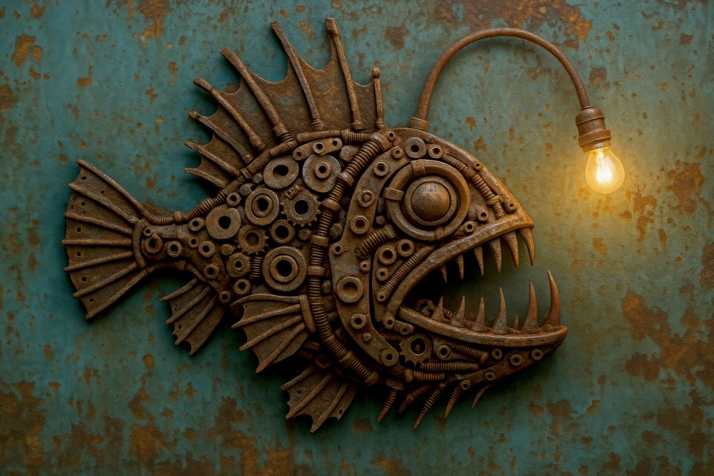 Bestel Industriële hengelvis van schroot met brandend lampje van Natalie Bruns op aluminium, muurcirkel, canvas, wandkleed, behang, spatwand, textielframe of een andere creatieve wanddecoratie. Kies je product, materiaal en formaat en ontwerp je unieke print!