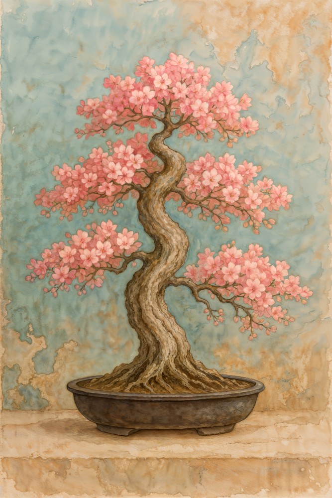 Bestel Japandi bonsai met bloeiende kersenbloesem van Natalie Bruns op aluminium, muurcirkel, canvas, wandkleed, behang, spatwand, textielframe of een andere creatieve wanddecoratie. Kies je product, materiaal en formaat en ontwerp je unieke print!