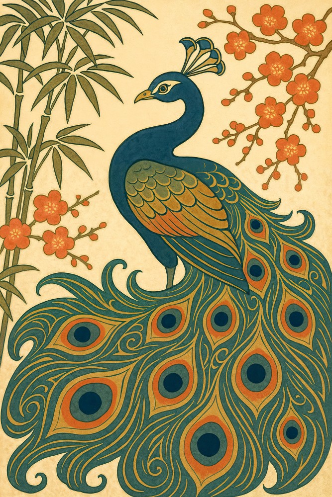 Bestel Japanse pauw met bamboe en bloesem in ukiyo-e stijl van Natalie Bruns op aluminium, muurcirkel, canvas, wandkleed, behang, spatwand, textielframe of een andere creatieve wanddecoratie. Kies je product, materiaal en formaat en ontwerp je unieke print!