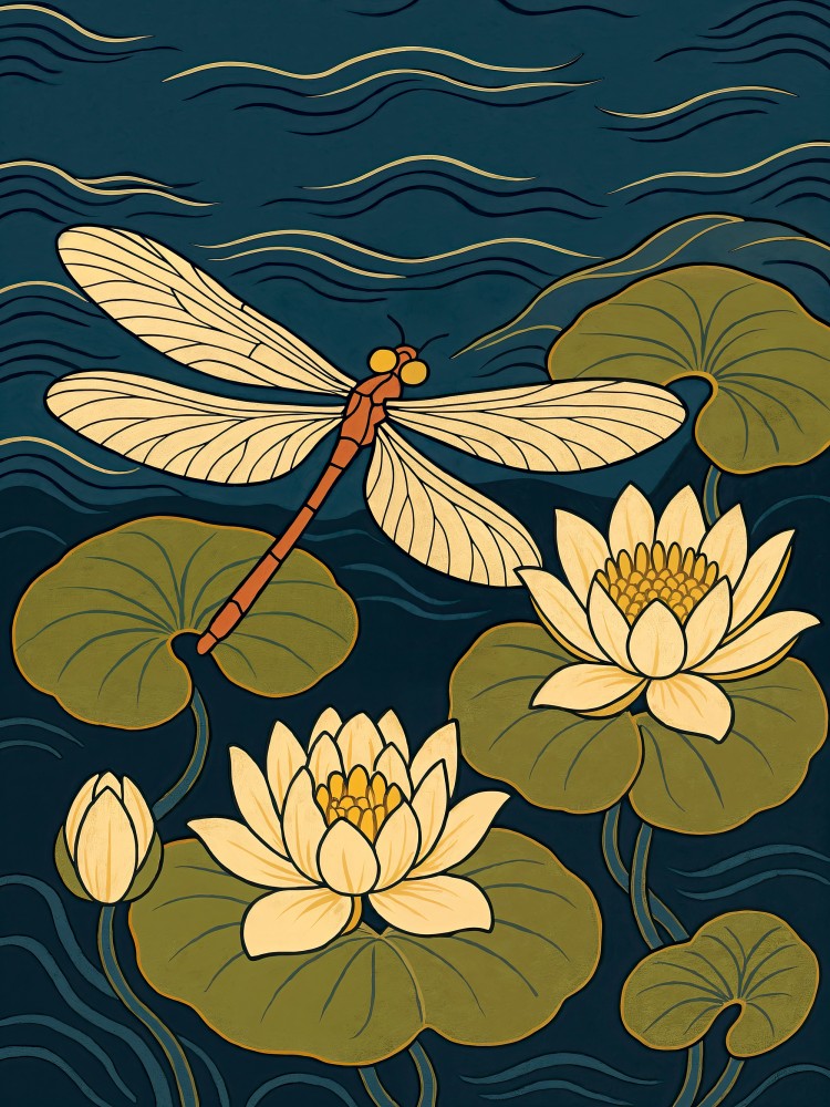 Bestel Libelle boven waterlelies in Japanse ukiyo-e stijl van Natalie Bruns op aluminium, muurcirkel, canvas, wandkleed, behang, spatwand, textielframe of een andere creatieve wanddecoratie. Kies je product, materiaal en formaat en ontwerp je unieke print!