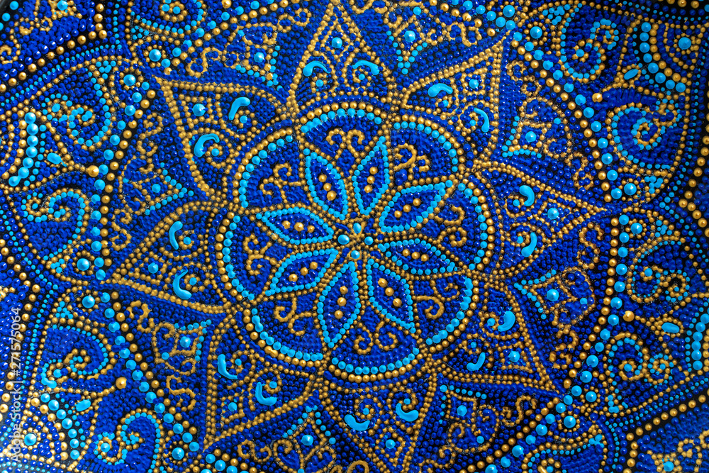 Inductie beschermer Decoratieve keramische plaat met blauwe en gouden kleuren, beschilderde platen, close-up. Decoratief porseleinen bord beschilderd met acrylverf, handwerk #271575064
