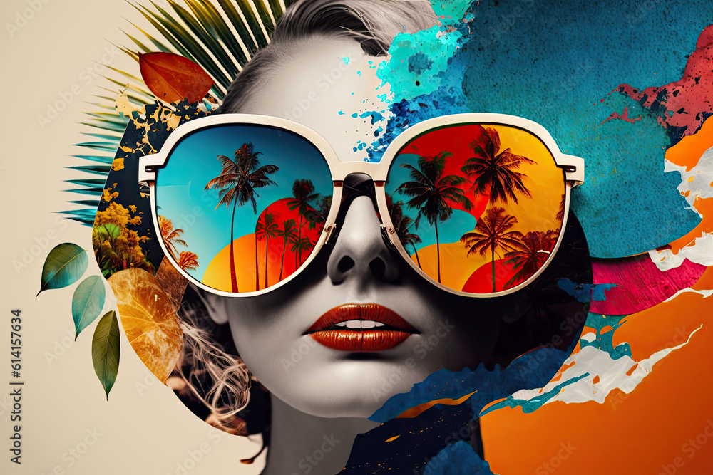 vrouw, zomer, mode, zonnebril, reizen, retro-stijl, modieus, vintage, collage, poster, vakantie, schoonheid, mooie, dame, zuur, reiziger, kapsel, lippen, rode lippen, grappig, palmboom, meisje, strand, reizend, gezicht, zee, clipart, ontsnappen, ansichtkaart, feestdag, nostalgisch, digitaal, kunst, afdrukken, magazijn, ontwerp, scheppend, dekken, schepper, uitsparingen, popart, illustratie, generatief, ai,