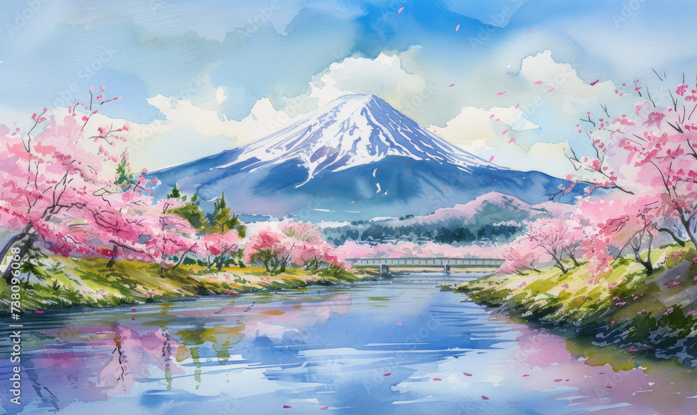 Inductie beschermer Watercolor Fuji mountain and Pink Sakura Trees along Uruigawa River in Spring, Fujinomiya, Shizuoka, Japan #738096068