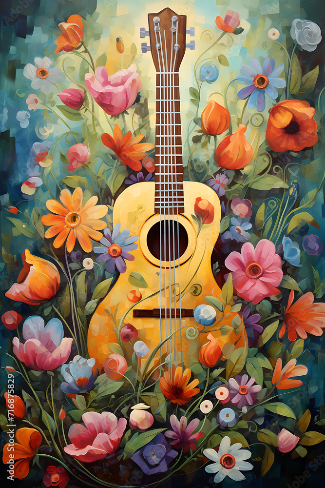 Inductie beschermer Gitaar met bloemen kleurrijke muur kunst muziek print wallpaper achtergrond - gitaar olieverfschilderij - muziekinstrument artwork #716875829