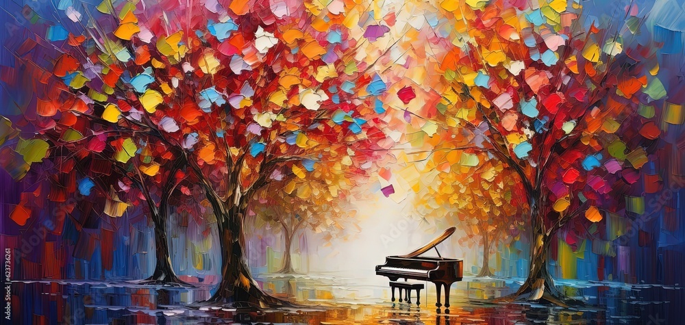Inductie beschermer schilderstijl illustratie banner behang, herfstbos met kleurrijke bladeren, piano muziek spelen in park Generatieve Ai #623736261