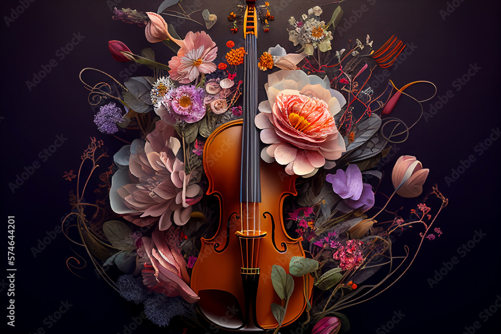 Inductie beschermer viool en bloemenkunst op de donkere achtergrond. Generatieve AI. #574644201