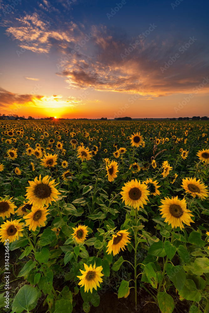 Inductie beschermer Prachtige zonsondergang boven zonnebloemveld #314236685