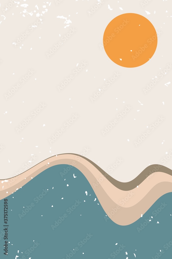 Keuken achterwand Abstracte hedendaagse esthetische achtergrond met woestijn, bergen, zon. Aardetinten, gebrand oranje, terracottakleuren. Boho-wanddecor. Moderne minimalistische kunstprint uit het midden van de eeuw. Organische vorm Vector