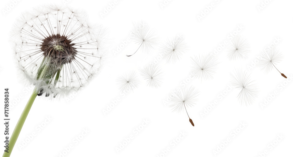 Keuken achterwand Dandelion flower seeds flying in the wind isolated on a white background