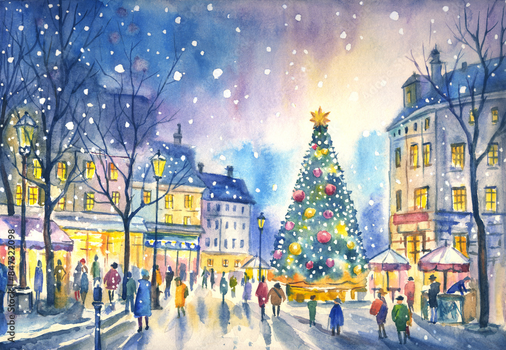 Keuken achterwand Watercolor landscape of a New Year or Christmas city with a New Year tree, houses and people. #847322098