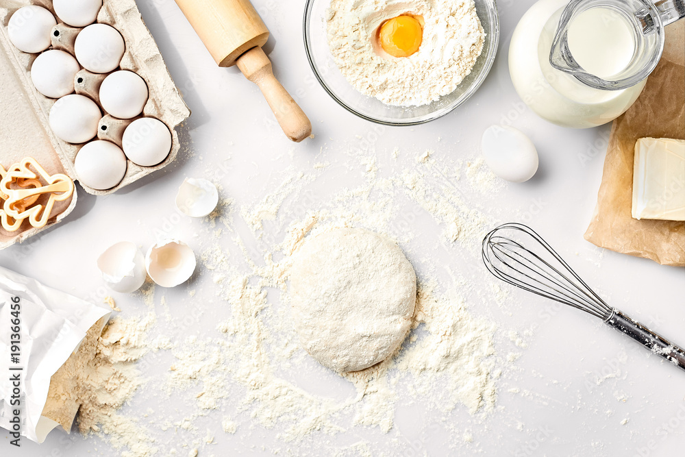 Muurcirkel Rauw deeg klaar om te kneden op witte tafel. Bakkerijingrediënten, eieren, meel, boter. Vormen voor het maken van koekjes. #191366456