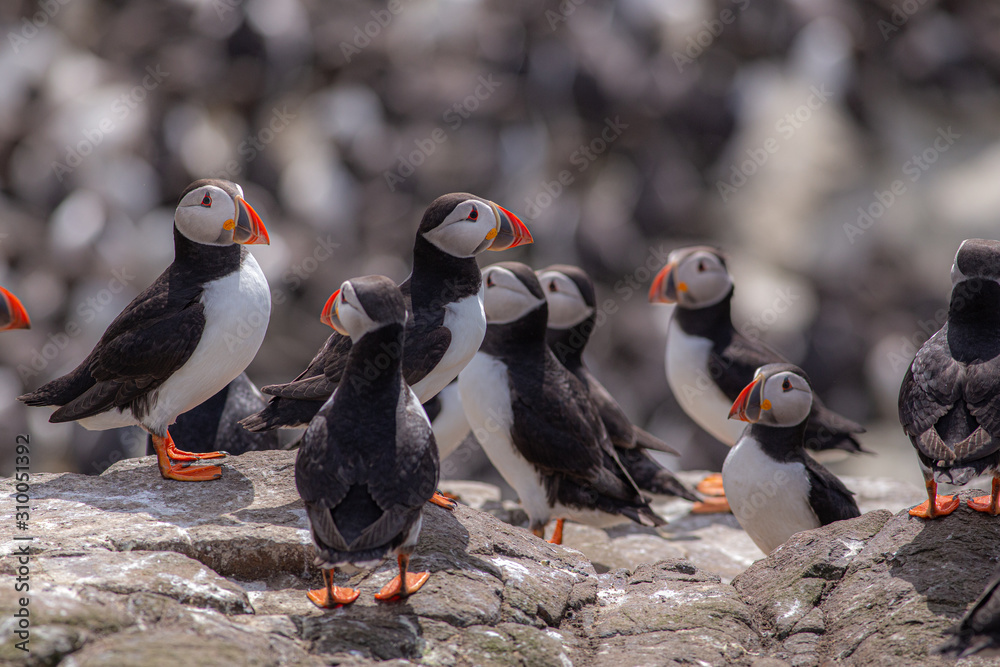 Muurcirkel Schattige kleine papegaaiduiker die op de rots staat bij Farne Islands, Engeland #310051392