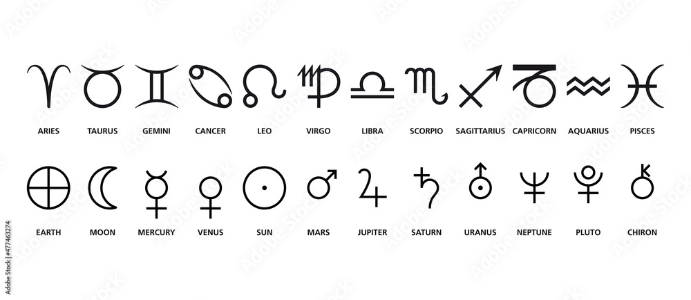Muurcirkel Symbolen van astrologische tekens en planeten. Veelgebruikte symbolen in de astrologie waaronder tekens van de dierenriem, aarde, zon, maan, de planeten en Cheiron. Zwart-wit afbeelding, Engelse labeling. #477463274