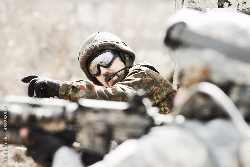Muurcirkel Zijn peloton leiden. Profiel van een commandant die bevelen geeft aan zijn soldaten terwijl hij plat op de grond ligt met geweren in de hand. #489268559