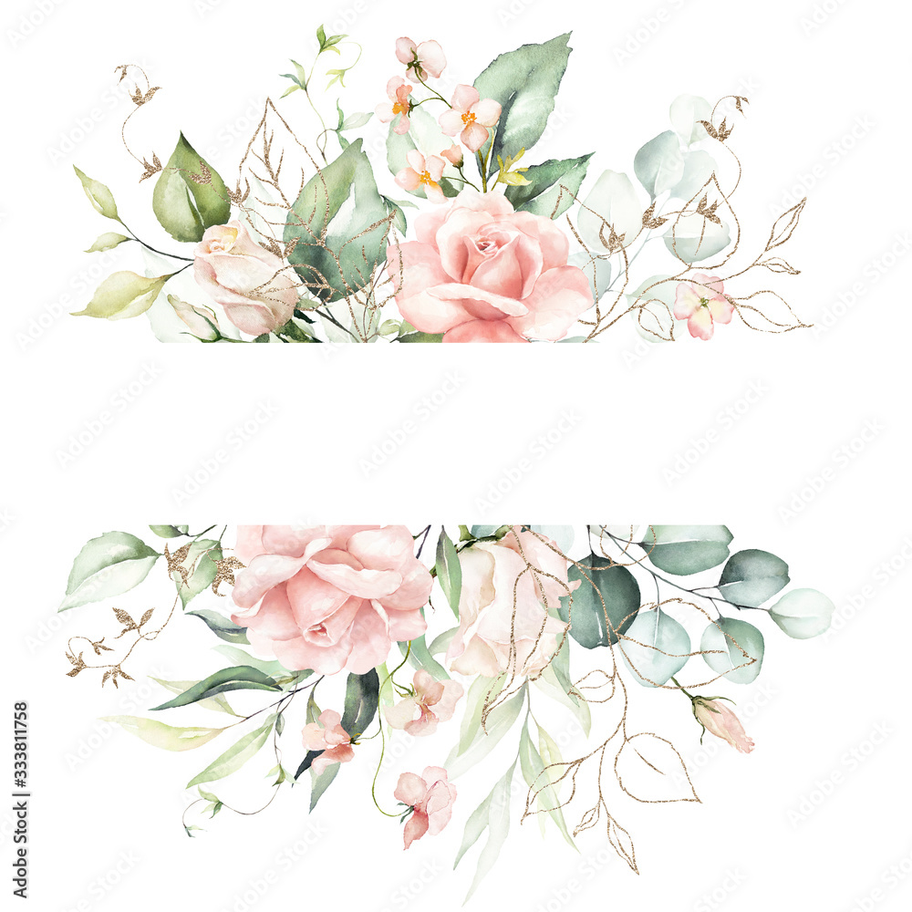 Plexiglas Aquarel bloemen frame / grens - bloemen, groene bladeren & gouden elementen, voor bruiloft stationair, groeten, wallpapers, mode, achtergrond. Eucalyptus, olijf, groene bladeren, enz.