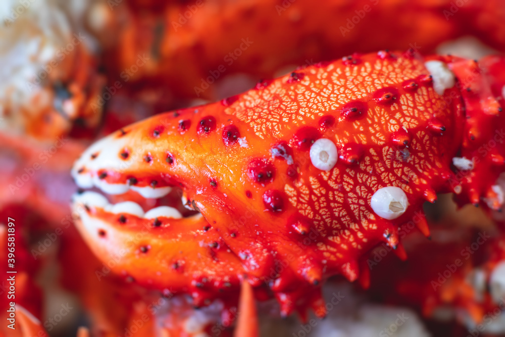 Plexiglas schilderij Kamtsjatka-krab, bevroren rode koningskrab, Alaska-koningkrab van dichtbij, levendig macrobeeld in een lokale viswinkel #396581897