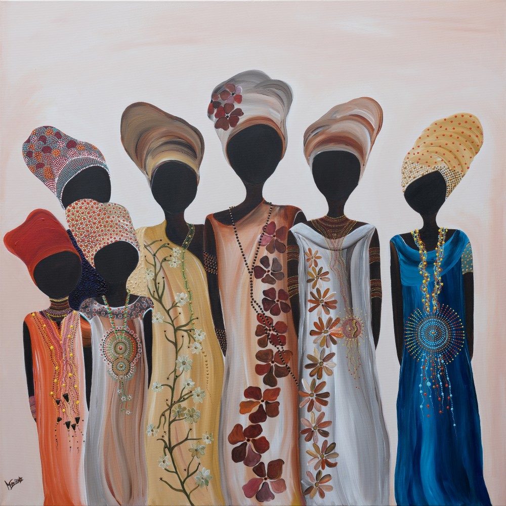 Zendaya, geïnspireerd door Zimbabwe, betekent ‘dankbaar’. Het toont zeven Afrikaanse vrouwen, ieder met een eigen stijl en uitstraling. De zachte crème-achtergrond laat de kleuren van hun kleding prachtig tot leven komen, terwijl oranje nuances en een diepe blauwe tint de sfeer van harmonie versterken. Subtiele details zoals sieraden met bloemenmotieven en kettingen geven de afbeelding extra diepte en karakter. Zonder gezichten, maar met een sterke aanwezigheid, is deze print een stijlvolle toevoeging aan elke woonruimte. Verkrijgbaar op canvas, aluminium, muurcirkel, wandkleed of ander materiaal.