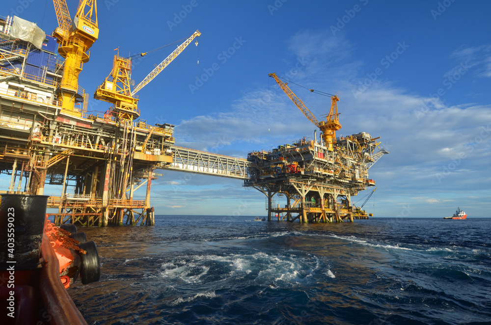 Plexiglas schilderij Offshore-platforms Marlin A en B in Bass Strait Victoria, Australië, gezien vanaf een werkboot. #403559023