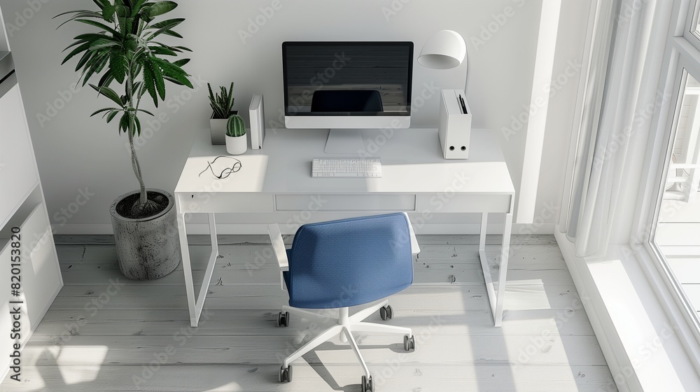 Plexiglas schilderij Oficina en casa con escritorio blanco y silla azul, espacio de trabajo moderno y minimalista #820153820