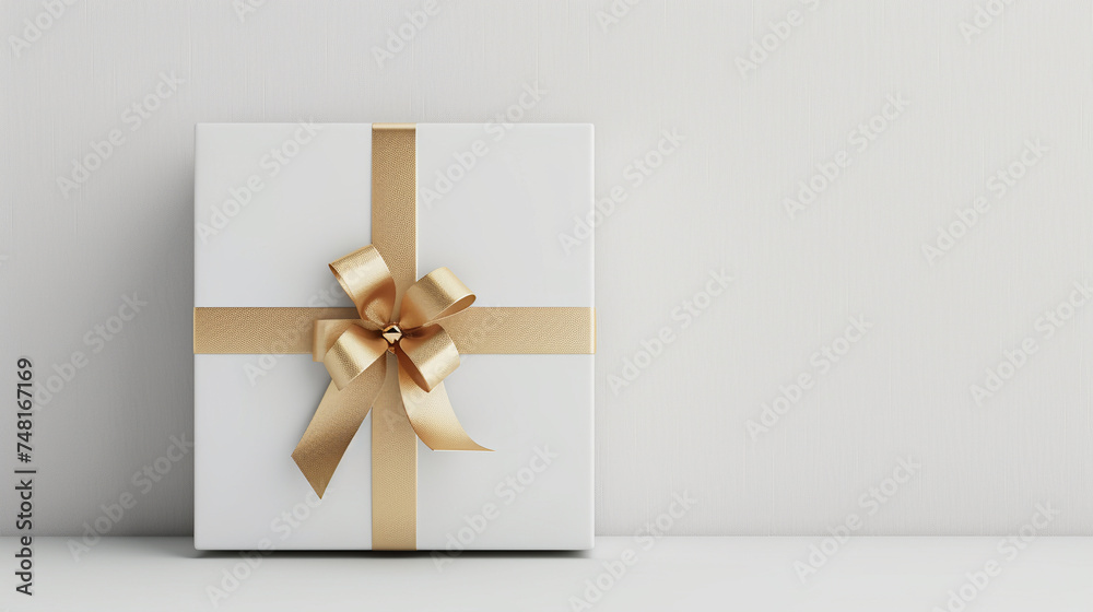 Plexiglas schilderij Paquete de regalo blanco para celebración con cinta y lazo dorado con fondo blanco. #748167169