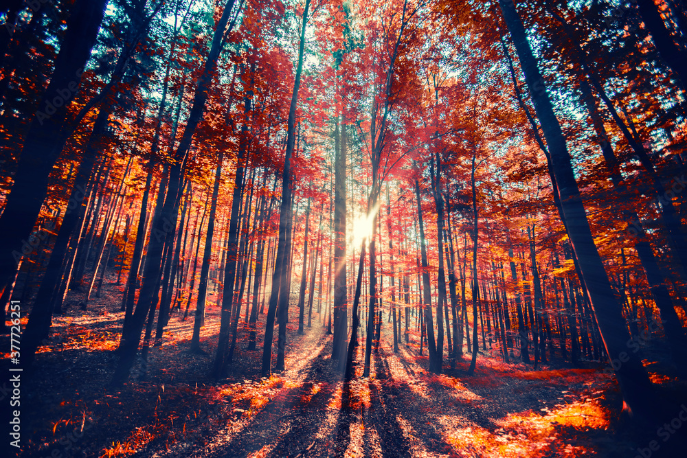 Plexiglas schilderij sun ray sin herfst bos #377726251