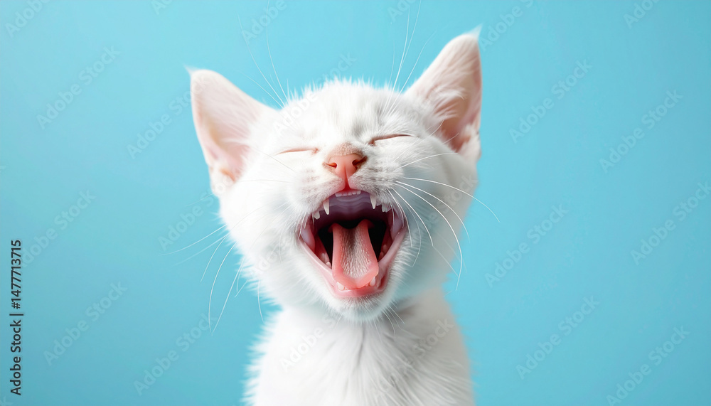 Plexiglas schilderij Retrato de un cachorro de gato blanco sano y feliz maullando con la boca abierta sobre un fondo azul #1477713715