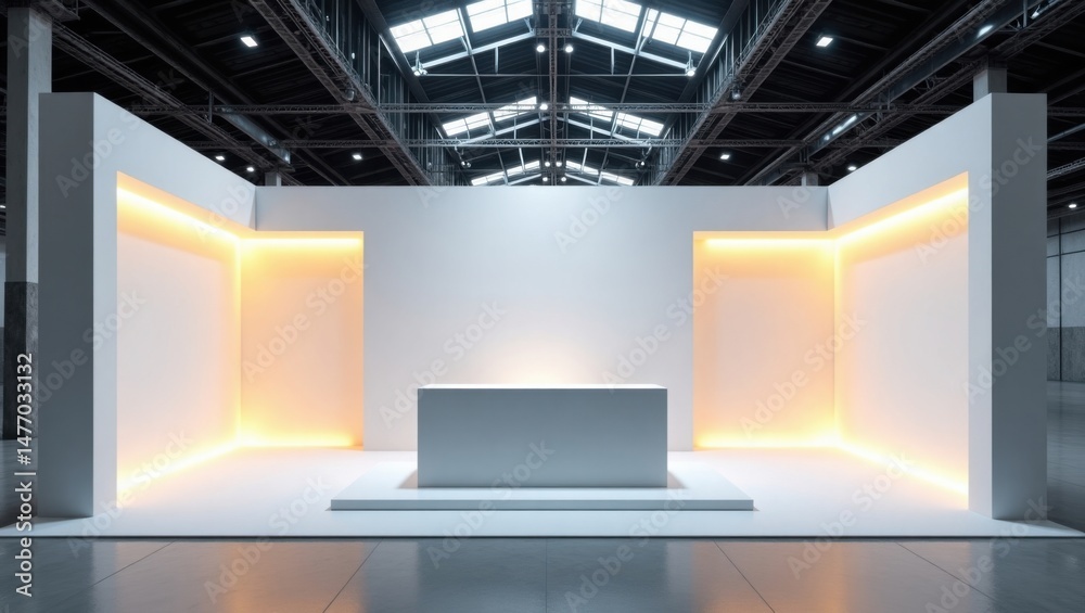 Plexiglas schilderij Stand de exposición empresarial blanco en blanco con podio central, paneles de pared retroiluminados y suelo minimalista en un lugar espacioso #1477033132