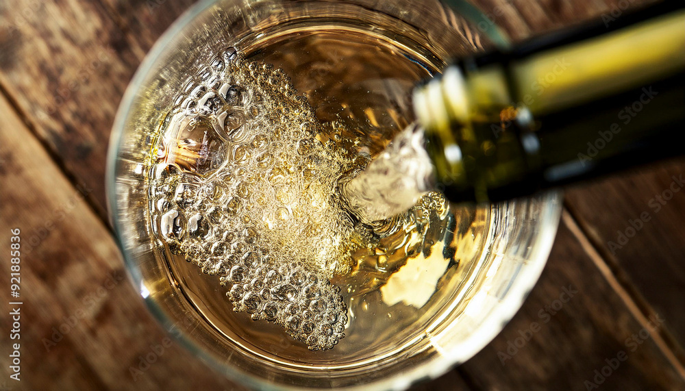 Plexiglas schilderij Vista en primer plano de vino blanco que se vierte en el interior de una copa de cristal #921885836