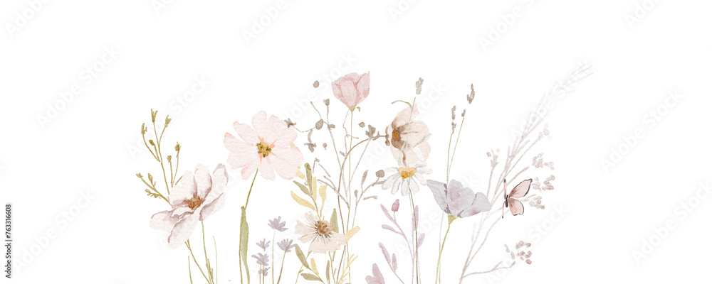 Plexiglas schilderij Watercolor Wildflowers border - illustration with delicate flowers, for wedding stationary, greetings, wallpapers, fashion, backgrounds, textures, DIY, wrappers, cards. #763316608