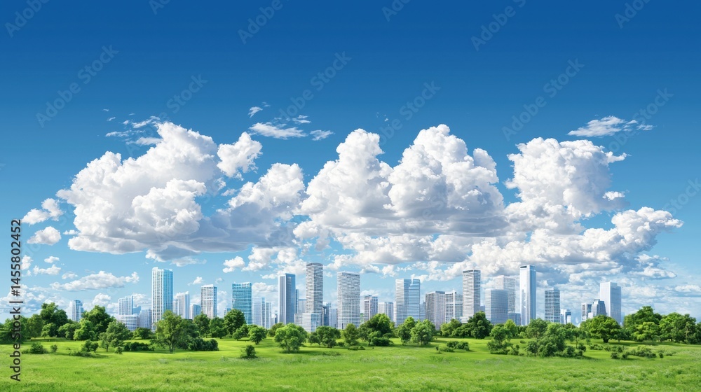 Akoestisch textielframe (Artframe) A city skyline with tall buildings and a large field of green grass in the foreground. #1455802452