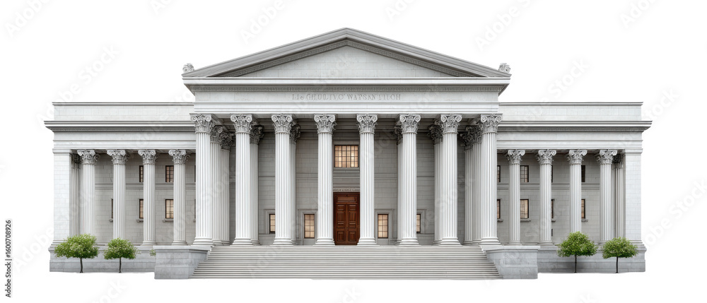 Akoestisch textielframe (Artframe) A grand neoclassical building with tall Corinthian columns, a triangular pediment, and symmetrical windows flanking a large central wooden door. #1600708926