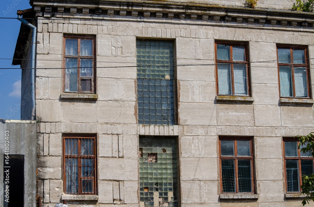 Akoestisch textielframe (Artframe) A large building with many windows and a large window in the middle. The building is old and has a lot of damage #1641802403