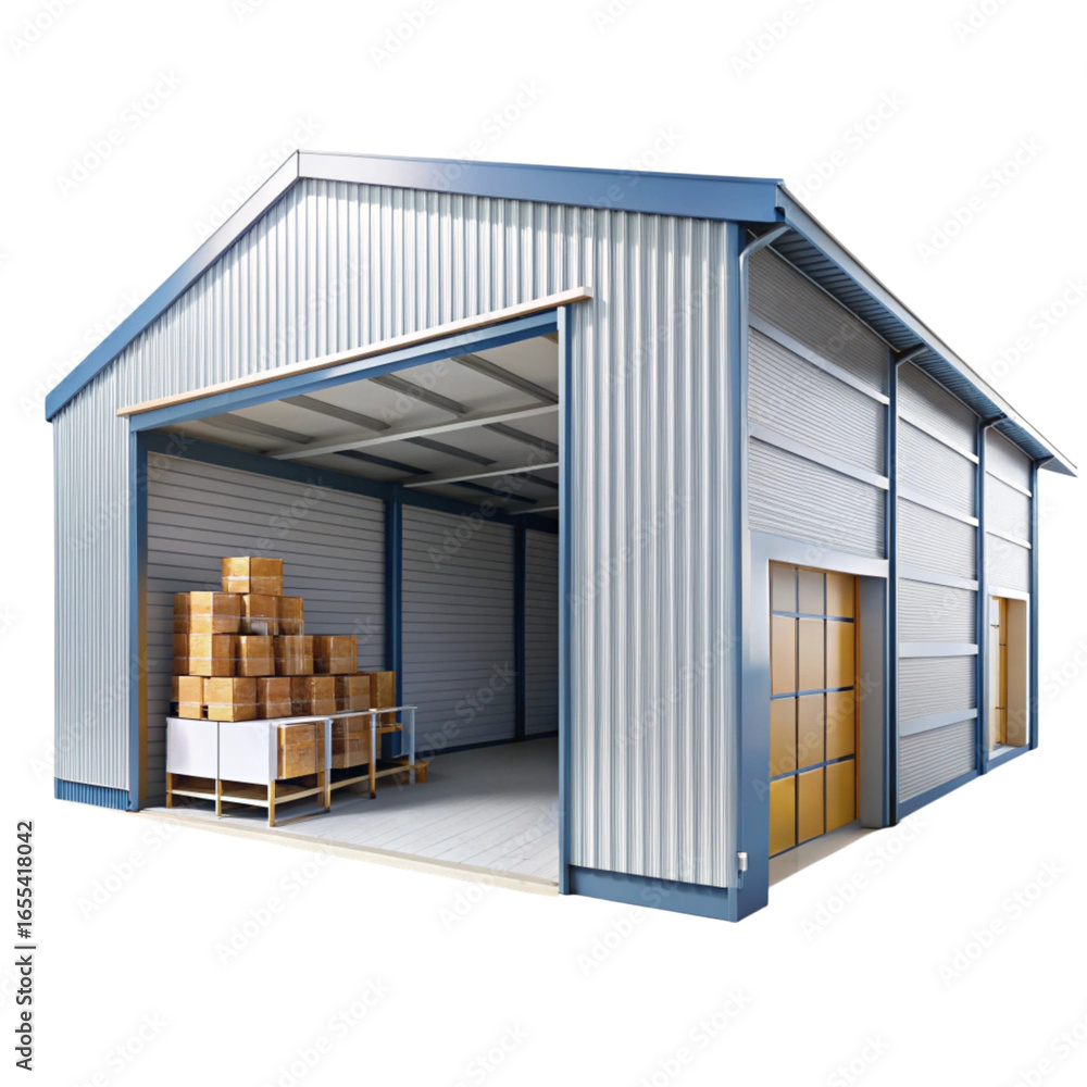 Akoestisch textielframe (Artframe) A large metal storage building with boxes and a cart inside #1655418042