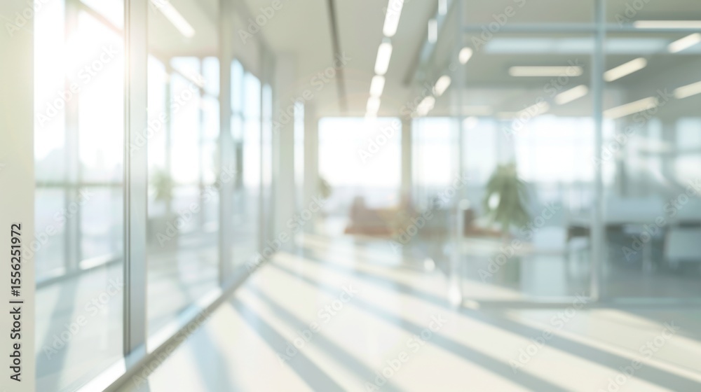 Akoestisch textielframe (Artframe) Blurred office interior background. Empty light open space office with big windows, many glasses walls, desks, chairs and green plants. Modern indoor business environment #1556251972