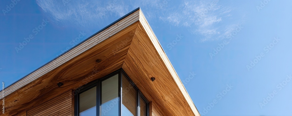 Akoestisch textielframe (Artframe) Exterior corner of a modern building with a wooden roof overhang and large windows #1676748447