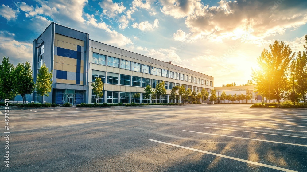 Akoestisch textielframe (Artframe) High school building with large parking lot and signage #1497705411