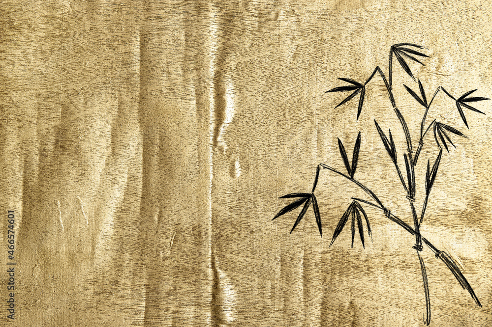 Art frame Gold wooden background bamboo plant sketch. Golden texture