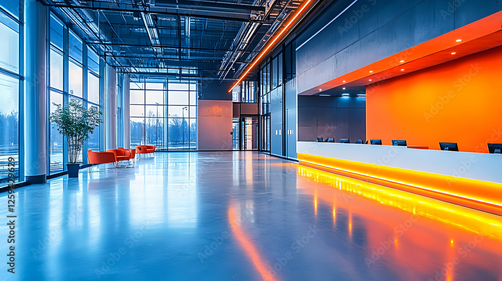 Akoestisch textielframe (Artframe) Modern building interior with orange accents, sleek reception desk, and large windows offering natural light. Perfect for corporate or architectural designs. #1259429629