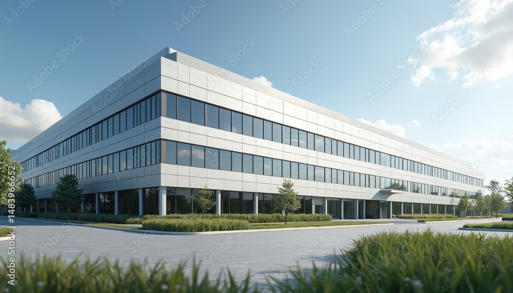 Akoestisch textielframe (Artframe) Modern corporate building exterior against blue sky. Contemporary architecture, office, factory, warehouse structure. Business environment, commercial property, industry, technology, innovation, #1483966652